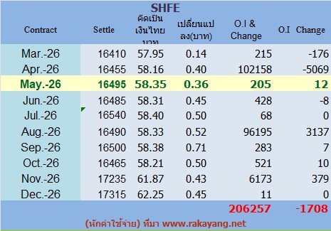 เทียบจากราคา(Settle)คิดเป็นเงินไทย(หักค่าใช้จ่าย)58.16บาท/กก. ราคาเพิ่มขึ้น 0.40บาท/กก.
