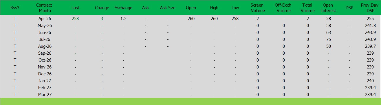 ราคาปิดตลาดยาง SICOMประจำวัน อังคาร ที่ 31มีนาคม2569ราคายาง RSS3 ราคาเดือนเม.ย. ราคาเพิ่มขึ้น 3เซนต์สหรัฐ ปิดที่ 258 เซนต์สหรัฐ