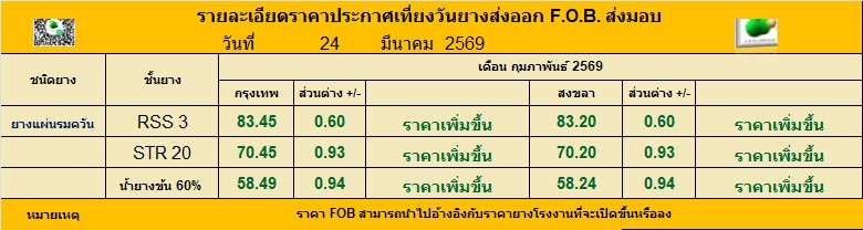 รายละเอียดราคาประกาศเที่ยงวันยางส่งออก F.O.B. ส่งมอบ ประจำวัน อังคาร ที่ 24 มีนาคม 2569