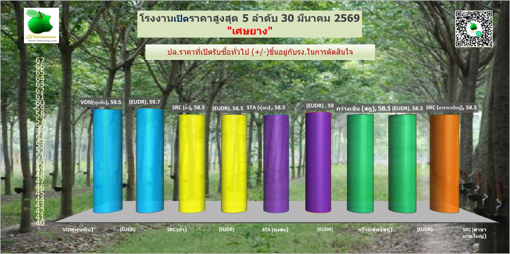 สรุปราคายางแผ่นรม/ดิบ เศษยาง เครฟ โรงงานทั่วไปประจำวัน จันทร์ ที่ 30 มีนาคม 2569
